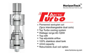 Lakeshore Vapors - Horizon Arctic Bottom Dual Set. Features: 1. BTDC: Bottom turbine dual coil, 100% USA made kanthal wire 2. Airflow adjustable function 3. Made of stainless steel and Pyrex glass 4. 3 SQMM4 (12 SQMM in total) intake holes 5. 100% organic cotton 6. Two resistances support different wattage, 0.2ohm supports 30-100W, 0.5ohm supports 30-80W 7. Juice capacity: 3ml 8. 510 threading